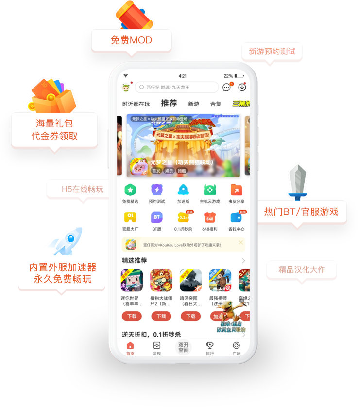 1、特色游戏资源:这是虫虫助手最大的亮点。平台设有专门的BT版、大型游戏、中文汉化等板块。你可以在这里找到大量送VIP、送元宝、无限金币的网游。